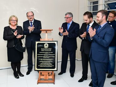 Placa inaugural foi descerrada pelo presidente Arnor Lima Neto, desembargadora Rosemarie Diedrichs Pimpão, prefeito Kosmos Panayotis Nicolaou, advogado Eduardo E. Tobera Filho e juiz do Trabalho José Vinicius de Sousa Rocha