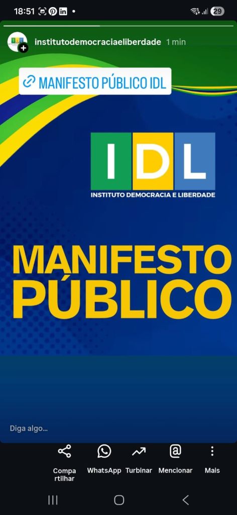 O Instituto Democracia e Liberdade (IDL) vêm a público manifestar sua preocupação com os rumos da política e da justiça no Brasil, a partir da constatação de que várias instituições, que deveriam cumprir com a tarefa indelegável de garantir nossas liberdades democráticas, sofrem severo desgaste e grave desconfiança da população.